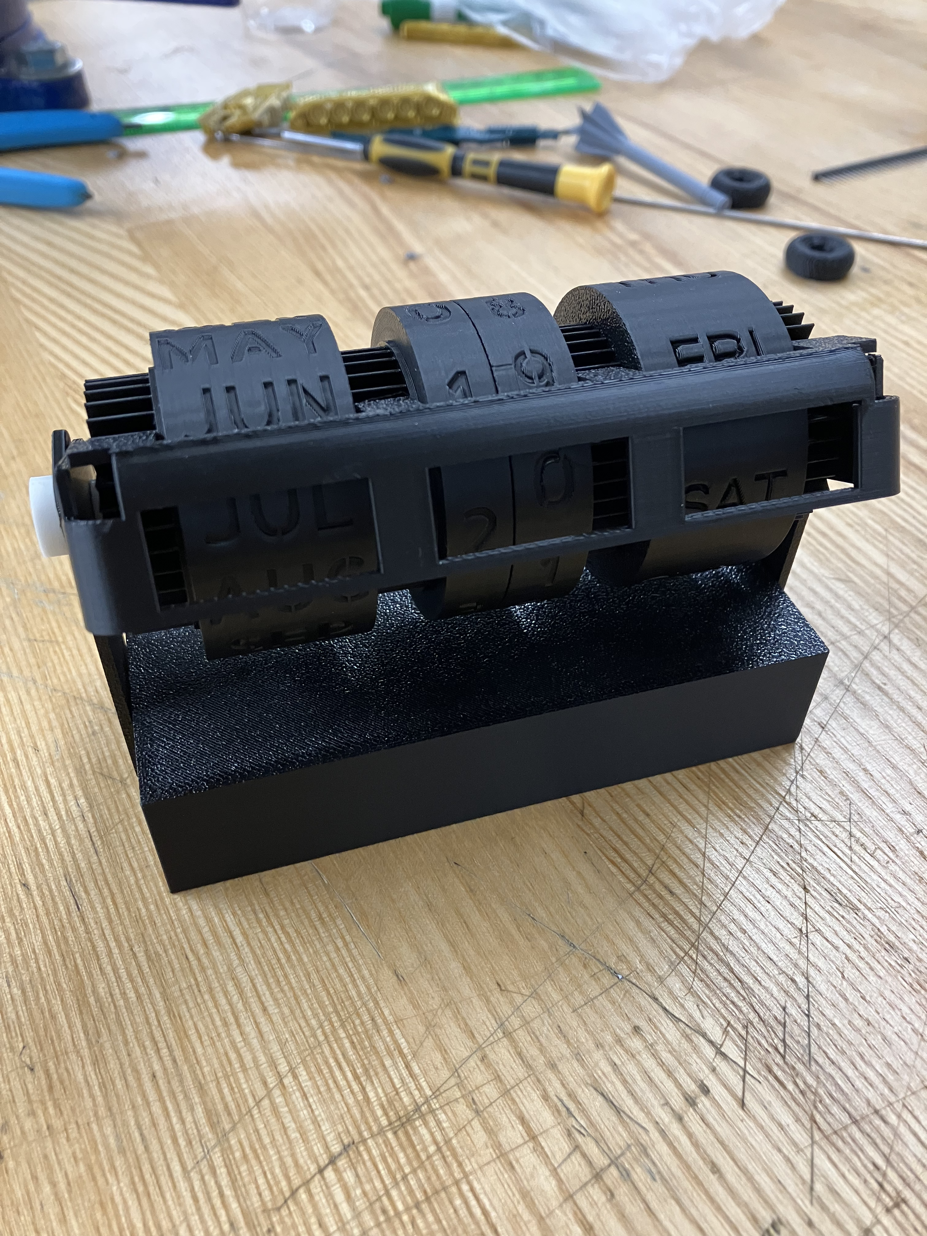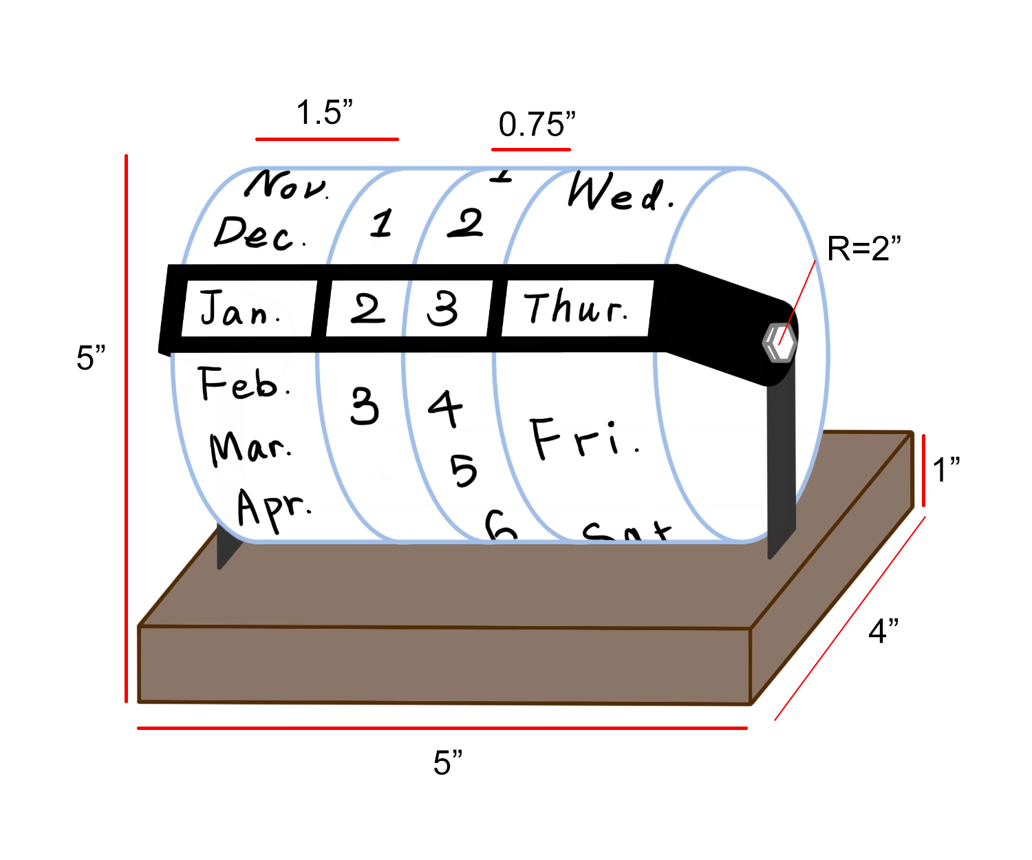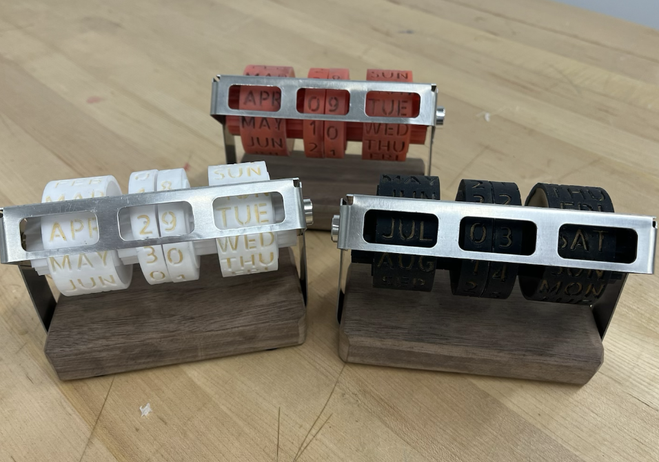 For the graduate course "Product Realization," teams of four were tasked with creating a simple design that could be mass produced, an element that was tested as we had to create 13 copies of the product. Additionally, extensive document creation and control was required for the entire project. Our group ended up creating a "ratchet calendar," a rolling calendar that makes a satisfying clicking noise every time a roller is moved. While I did help with the development of the design and worked on some of its construction, focusing particularly on the wooden base, my main job was document management. Over the course of the semester, I not only managed and enforced our Enterprise Data Management document, but maintained every single document as to remain consistent with each other and to have accurate, up to date information. Part of this was done through having a clearly defined style guide that I could use and make sure my teammates used, but it was also partially just constantly checking each document, and checking even more frequently as deadlines approached. This experience was a great simulation of a realistic design process, particularly due to the focus on the documentation. I was surprised that I ended up enjoying and thriving in this environment, and believe that I handled our documentation management exceptionally, as indicated by our team receiving the on-average highest scores for each documentation checkpoint out of the entire class.