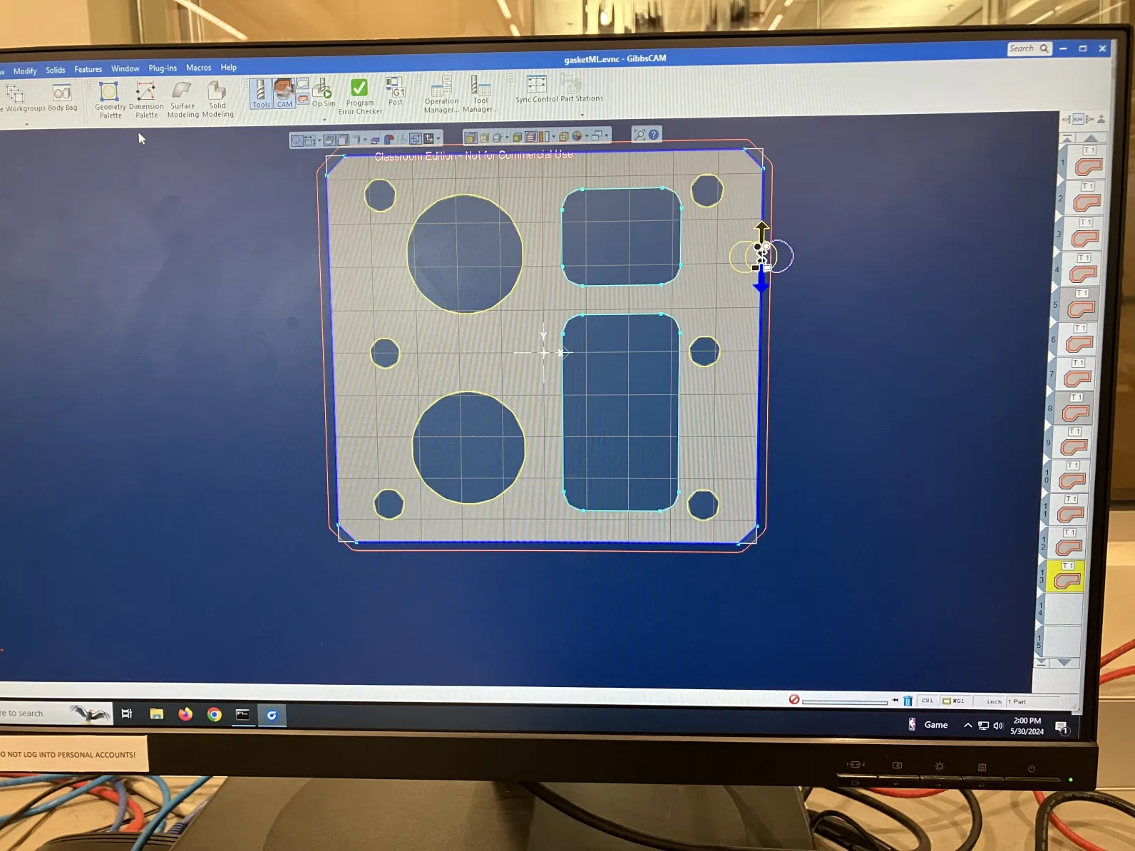 I was then able to quickly create a sketch in Solidworks of the gasket cover. After finishing the CAD sketch, I used GibbsCAM to prepare the part for machining in BU's EPIC.