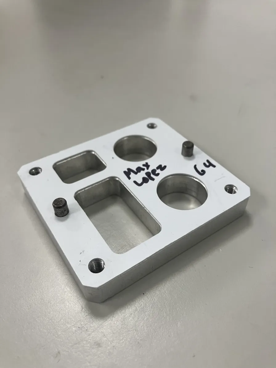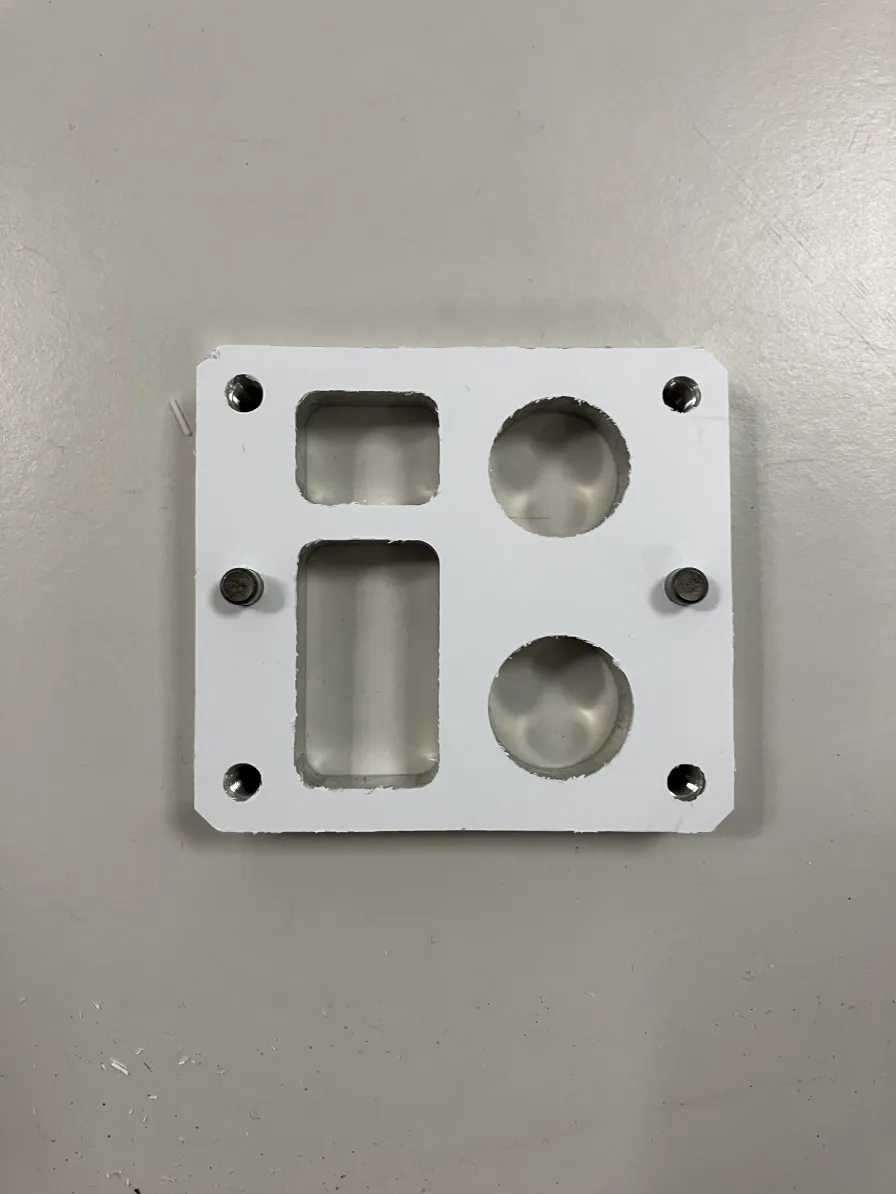 After noticing my blunder, I quickly corrected the error within the CAD model and returned to EPIC to mill another cover. While this second iteration initially seemed to fit correctly, I later found out I had made two small yet important errors. Firstly, I had made the diameter of the larger circles slightly larger than they were supposed to be. Secondly, when I was correcting the spacing of the side holes, I had still left them slightly too close to each other.