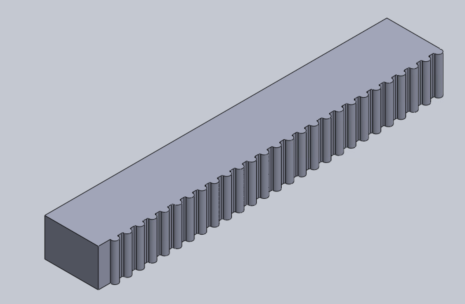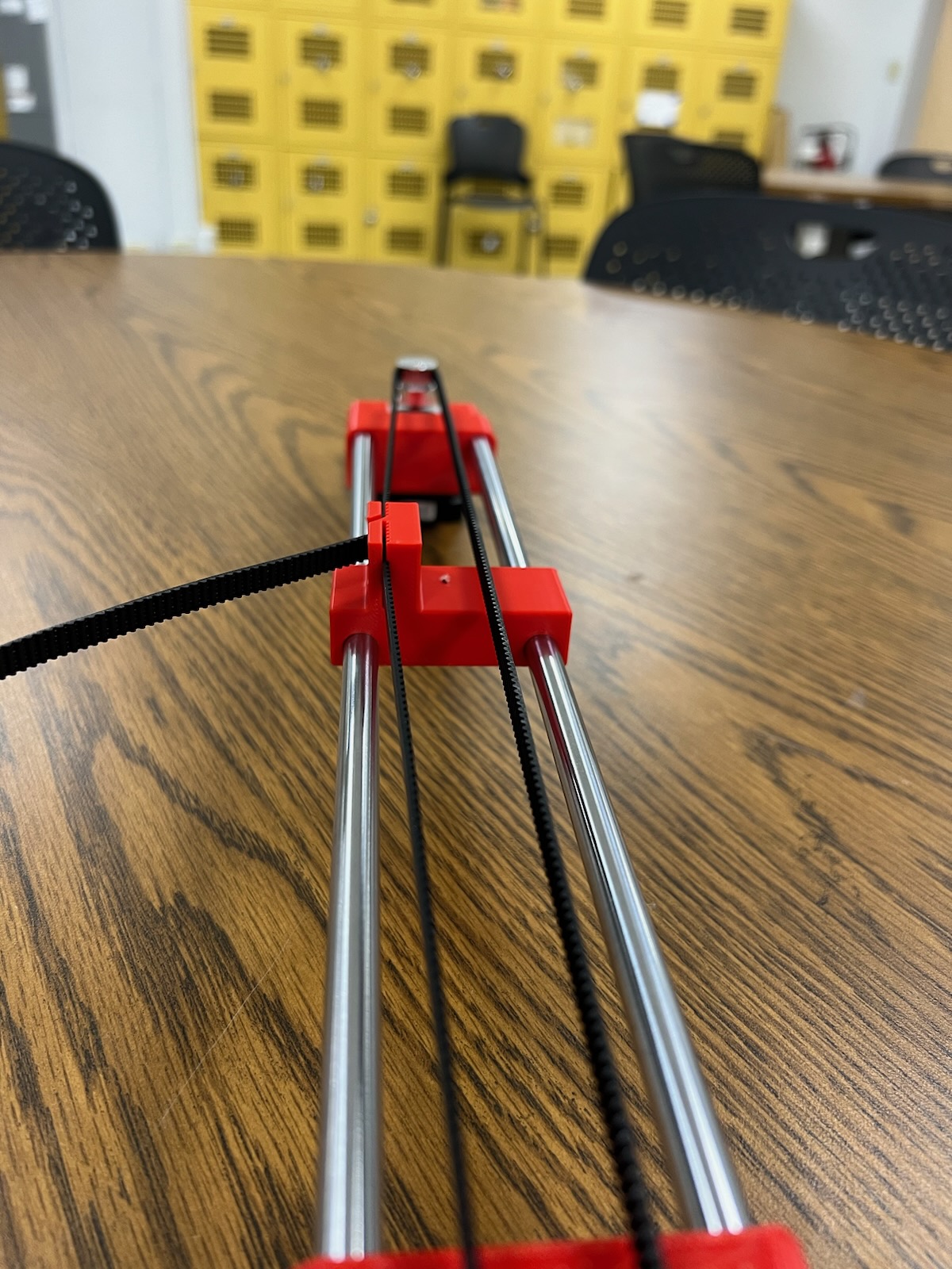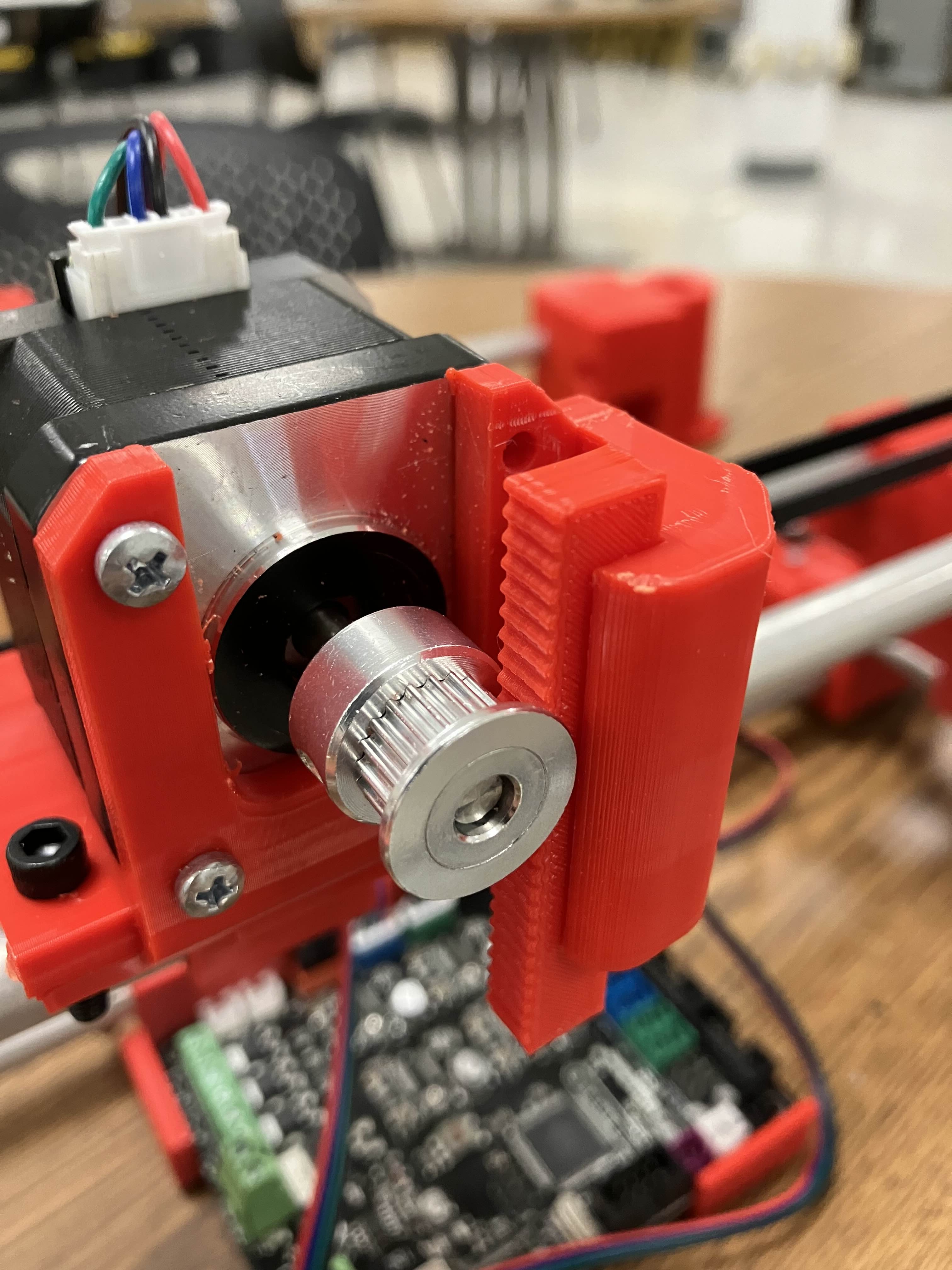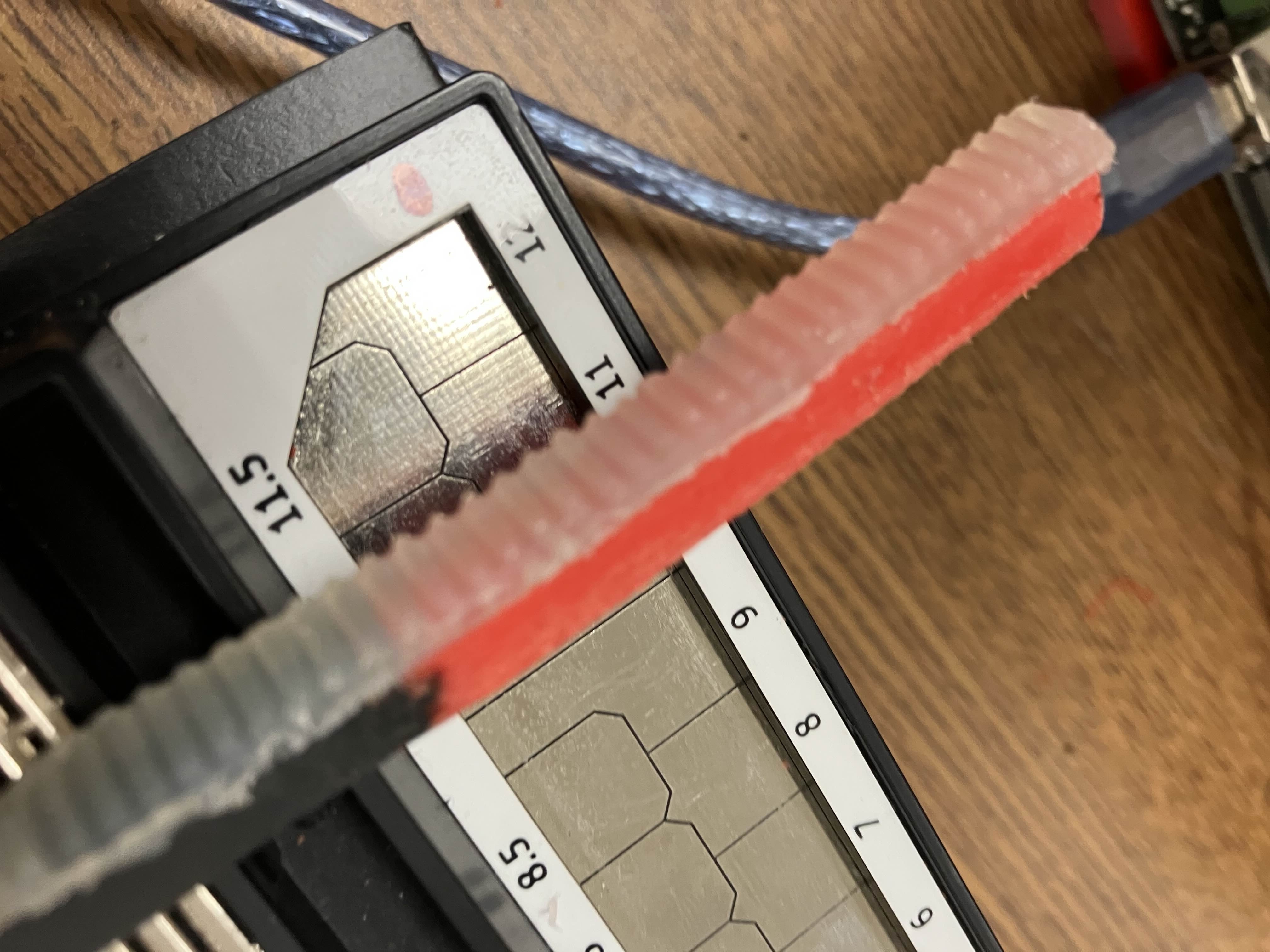 At this point, we had a near final design but there were two critical issues that we needed to address. Firstly, the Arduino code was just not working. We were usually able to move some part of the device, but never in the way we wanted it to. This would result in multiple meetings dedicated to just working through the code, bouncing ideas off of each other, and slowly but surely moving towards the Stylophone Player, well, playing the Stylophone. The other issue was the Stylophone pen, which was using both an extended tip and hot glue tread for the motor to latch onto to enable it to move up and down. This initially seemed to work, but we quickly realized that this either didn't latch on in the first place, or slowly degraded over time. We continued to recreate the hot glue tread, but time and time again, it would quickly fail. After a while, we realized that we needed something that would be consistent. We realized that since the belt moved perfectly along the motor, that means if we re-created the teeth from the carriage, it should fit. I was tasked with creating this new extension. After a thankfully shorter process than the initial teeth, I managed to make a new extension piece that worked perfectly.