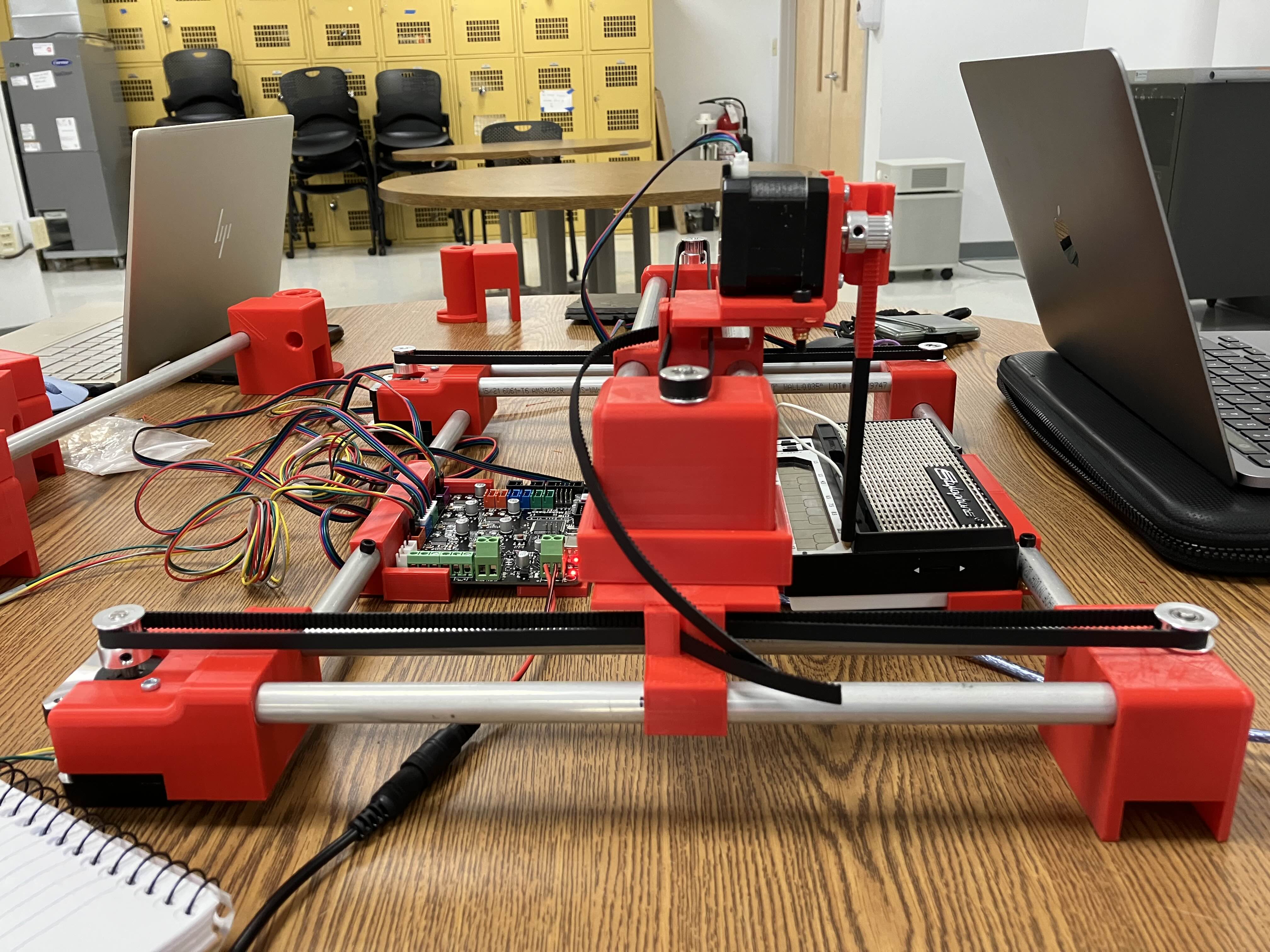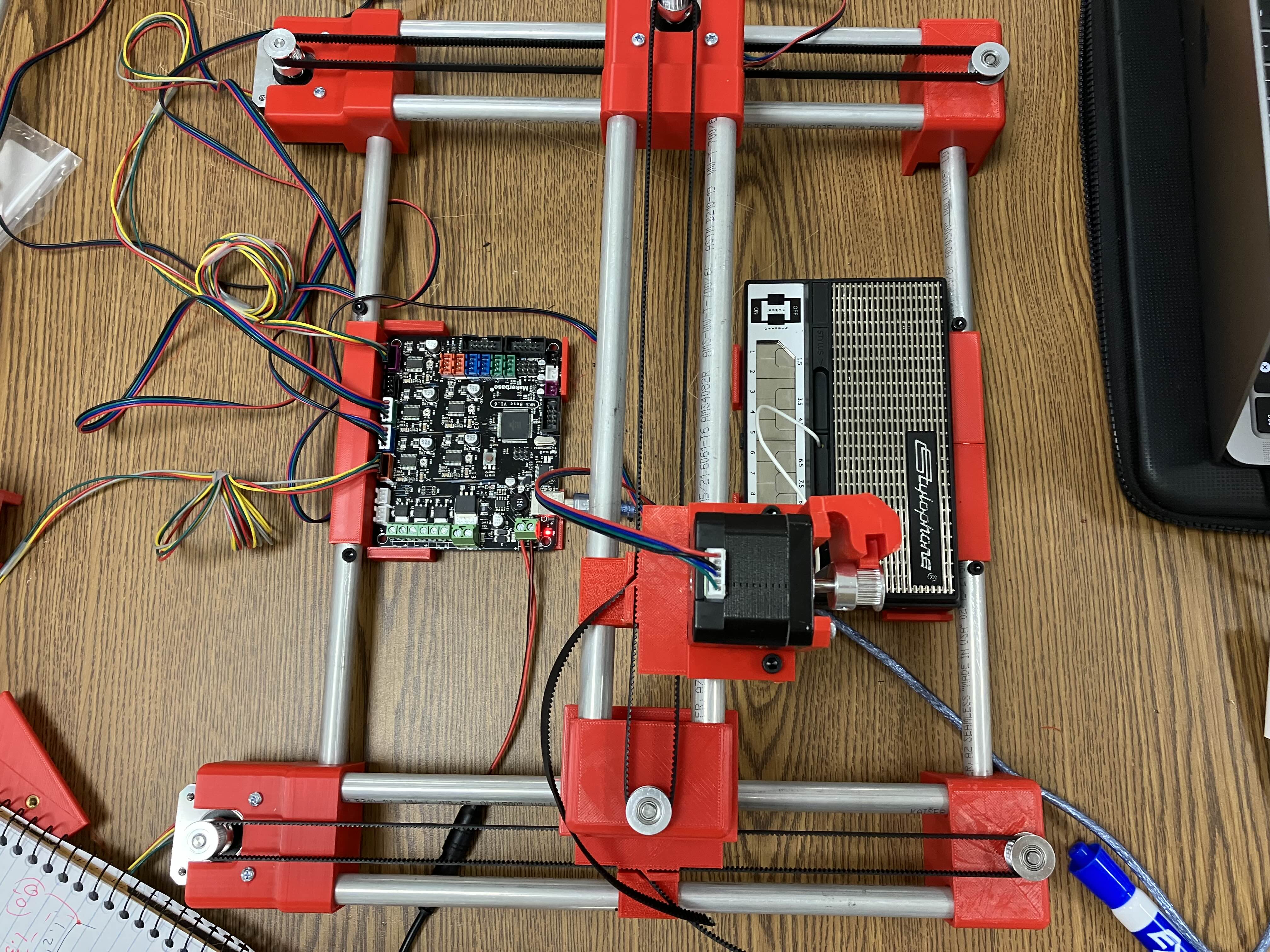 With this, the hardware of the Stylophone Player was complete. We first had it play a "chromatic scale," or a scale that just plays every note in order. This took a lot more trial and error than expected, as we learned that when variables such as speed changed, the device would become less precise and in turn, hit the wrong keys. Eventually, we fixed this simply by "honing in" on coordinates that would work no matter the speed. We then programmed in "The Imperial March" from the Star Wars franchise. When making the code, we designed it so that once we determined the correct coordinates, we could just enter the notes we wanted to play, and it should play them in that order. At this point, we encountered an odd error involving the pen pushing too hard down on the Stylophone, but just for the first note. We eventually figured out it was determining the Z-coordinates (how high up it was) incorrectly and that we had basically just gotten lucky for the chromatic scale, so we fixed this for both songs.