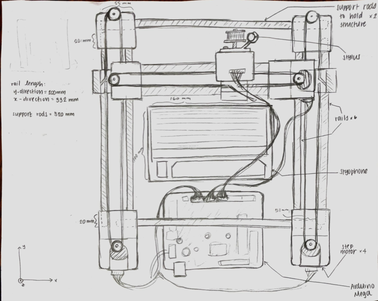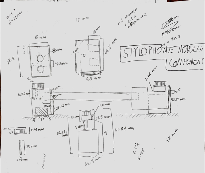 During a product design course I took in Summer 2024, I was tasked with designing a 3D Printed, custom designed device that has 2.5 degrees of movement freedom. My team of three quickly determined that we wanted to create a device that could play a musical instrument known as a "Stylophone." The stylophone is a small piano-like device that uses a pen with a metal tip, wired to the Stylophone, to play electronic notes. We concluded that the pen already being part of the Stylophone would ensure that it would work well as long as we could get it to move around correctly, and that making a device that could play a physical instrument just sounded like fun. We first sketched what a singular, modular linear actuator would look like, primarily to get measurements down. Then, we created a sketch of what we envisioned the entire unit to look like, making sure to add some extra supports so the unit could remain stable.