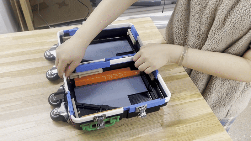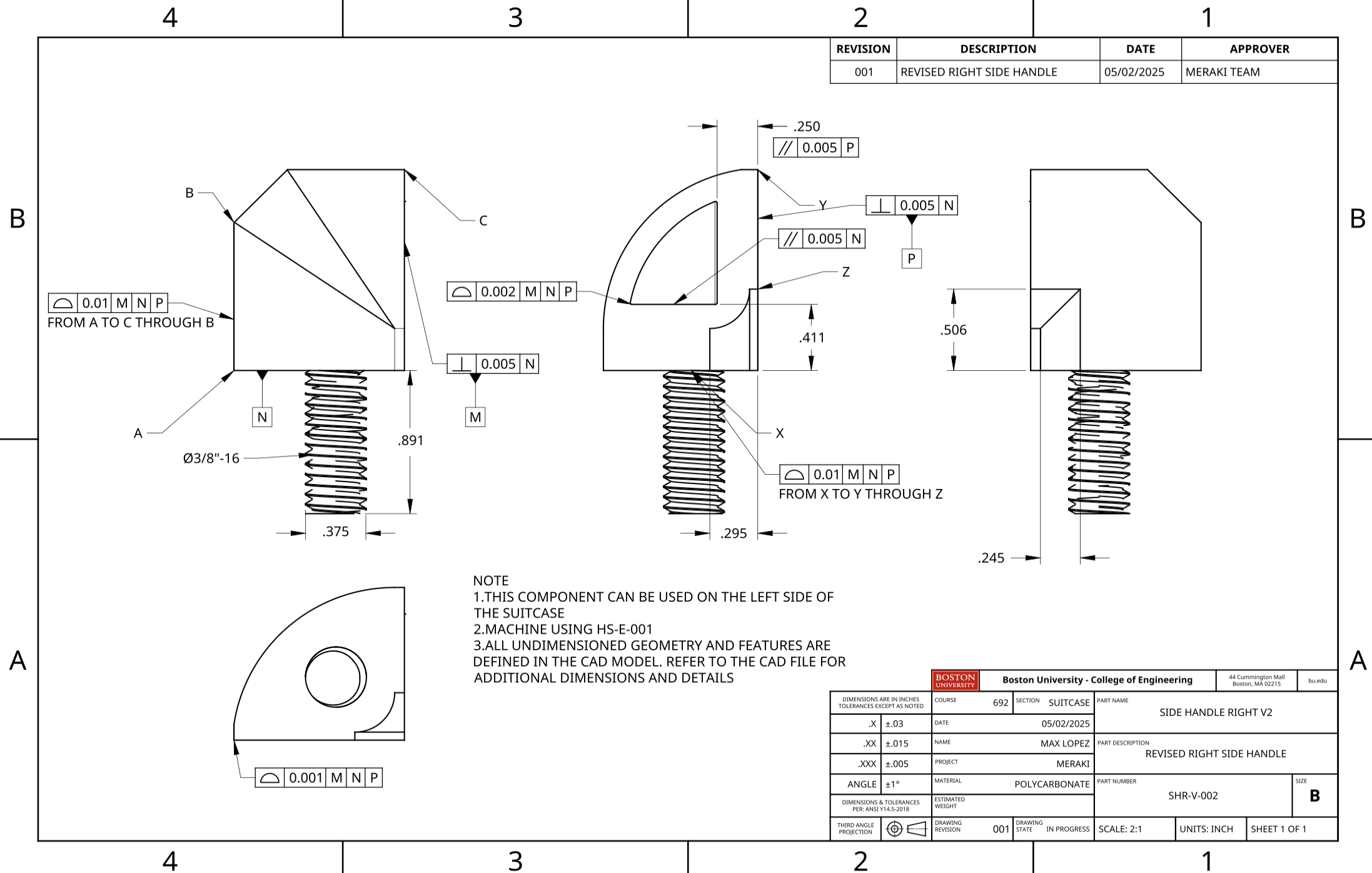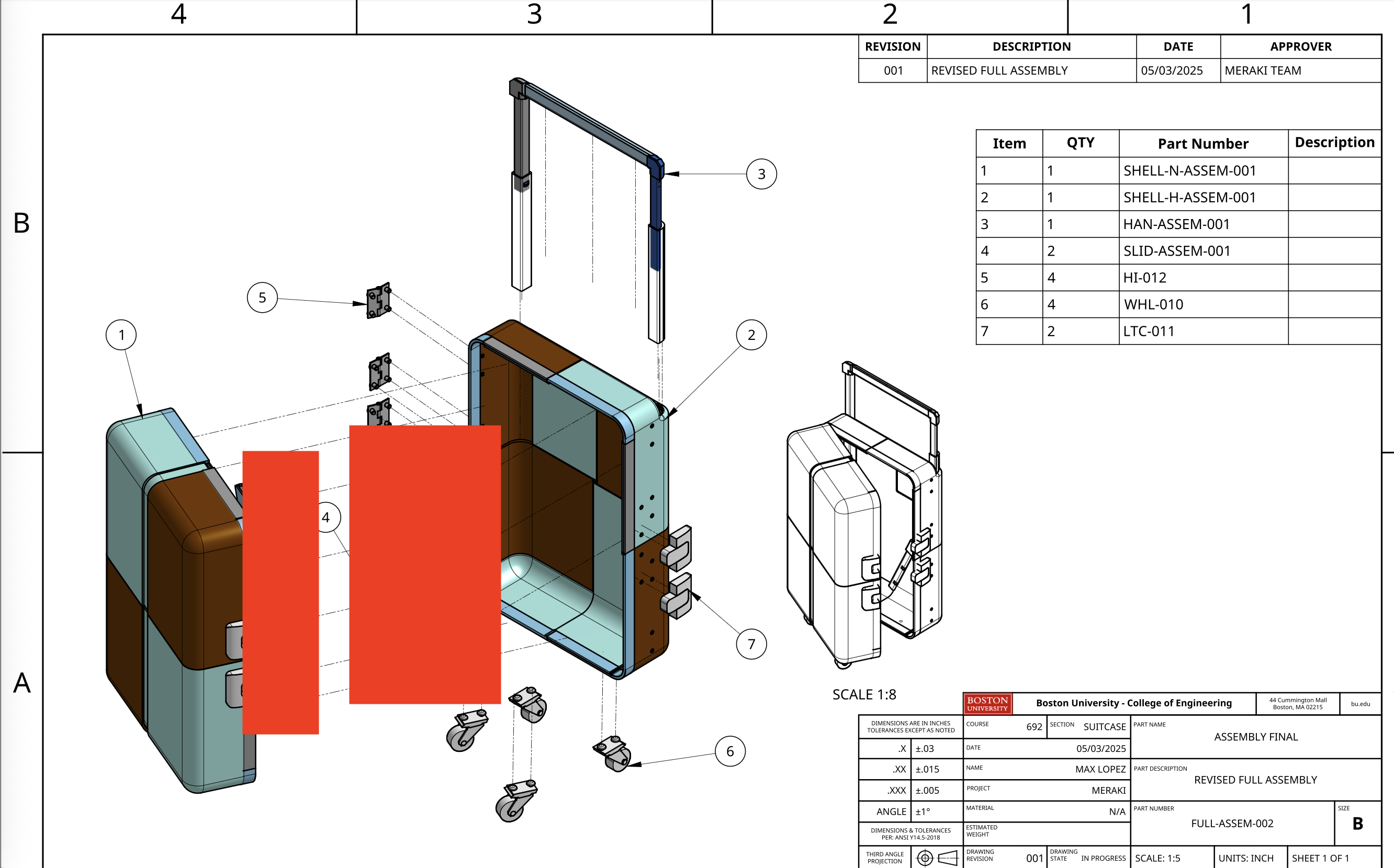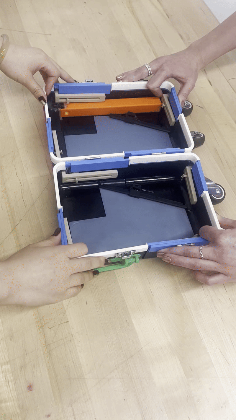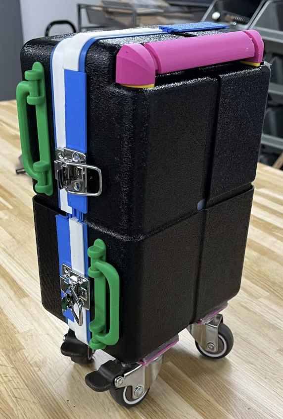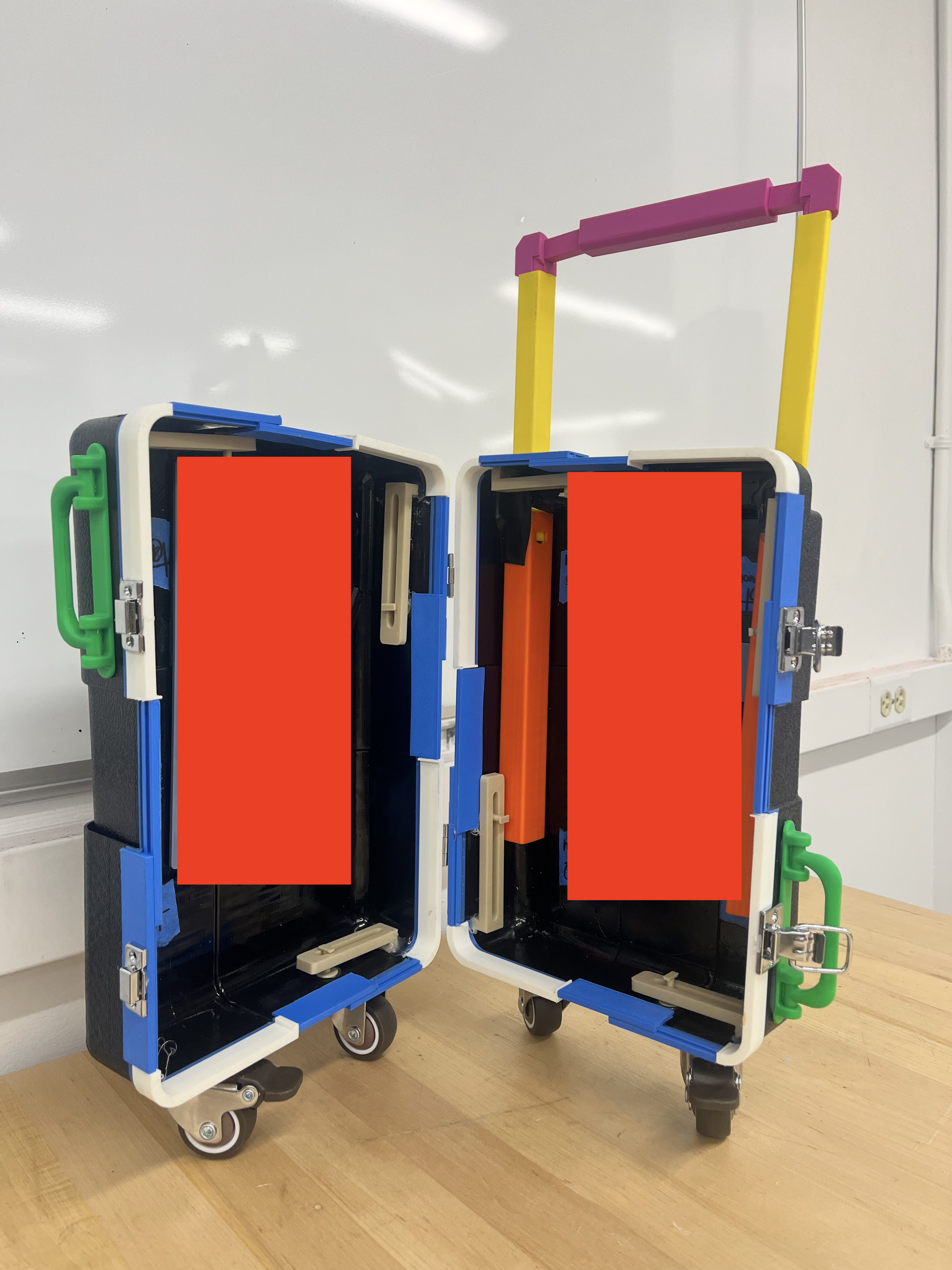 In the spring semester, our primary objective was to develop a physical prototype, as well as make any refinements as needed. I was tasked with both improving and creating the handle. On a regular suitcase, this may seem relatively straightforward, but because our design expands, so too does our handle. The design that had been created in the fall, while functional, had a large number of components, some of which we hadn't realized would be difficult to either manufacture and/or fit together. I decided to kill two birds with one stone by not only drastically reducing the part count while keeping the function near identical, but redesigning the components such that they could all easily either slide into each other or screw into each other during assembly. This required numerous revisions and 3D printed test parts to ensure everything physically worked with each other. Eventually, we had a fully working handle as well as a fully working half-scale prototype of the entire suitcase. This used a combination of 3D printed parts, different adhesives, and thermoformed polycarbonate to realistically simulate the full sized model as much as possible. We finally created a new set of blueprints to reflect the changes, this time only needing 70 pages.